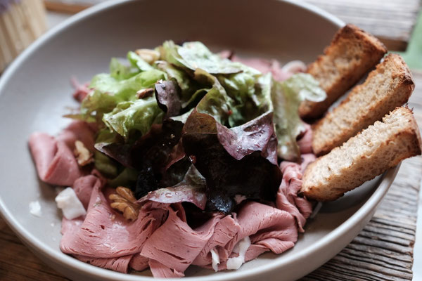 11-15:00 Erweiterte Mittagsküche : Geschmorter Kalbsbraten in Gemüse-Rotweinsoße mit Bandnudeln und für Vegetarier die Kürbis-Zuckermais-Käse-Rösti mit Knoblauchsoße und Blattsalat.