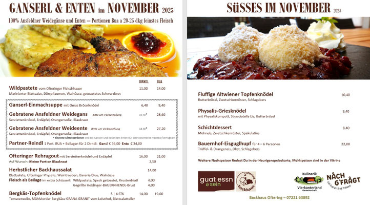 Jetzt braten wir für Euch bis Samstag 22.11. die Ansfeldner Weideganserl- und Enten. Es gibt weiterhin Ofteringer Rehragout und Wildpastete auf der Saisonkarte.