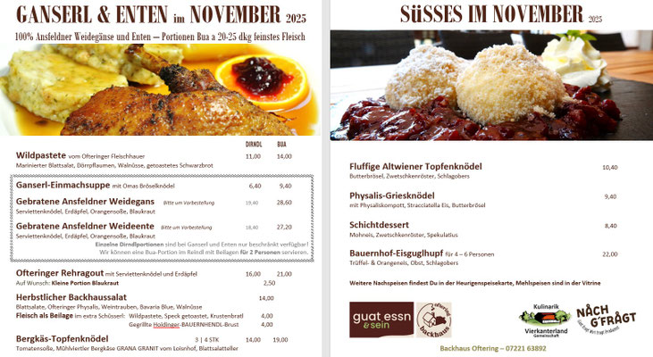 Seit Donnerstag 30.10. bis Samstag 22.11. braten wir für Euch die Ansfeldner Weideganserl- und Enten. Es gibt weiterhin Ofteringer Rehragout und Wildpastete auf der Saisonkarte.