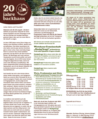 Die von uns gegründete "Gemeinschaft Kulinarik Vierkanterland" hat nun nach jahrelanger Entwicklungsarbeit zum 20-jährigen Backhausjubiläum die Plattform "Nochgf'rogt für Qualität & Nähe" vorgestellt, das riesige Informationsangebot in komprimierte, übersichtliche und verständliche Form zu bringen. Wirte, Produzenten und Gäste bemühen sich gleichermaßen gemeinsam um die Transparenz am Gästetisch. Mehr Infos dazu gibt's im Backhaus, bzw. ab Herbst bei den teilnehmenden Wirten. (Stand 29.6.2025)